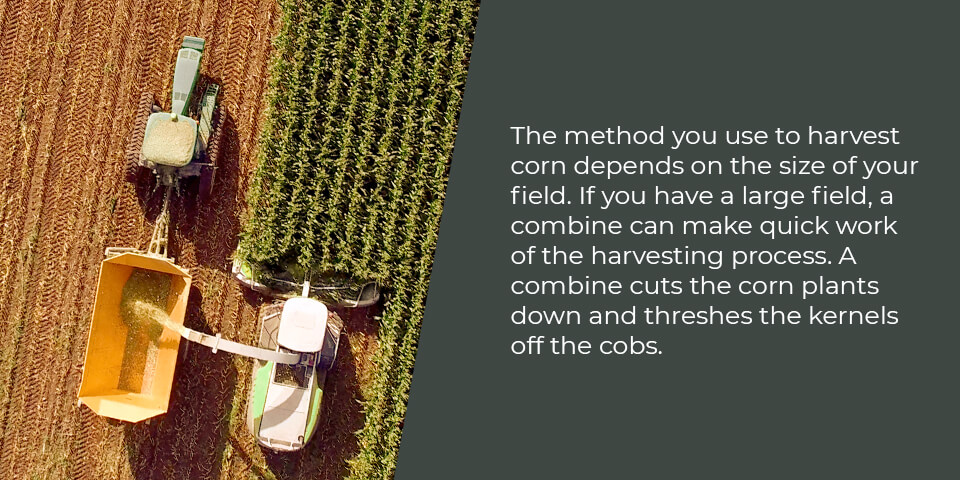 The method you use to harvest corn depends on the size of your field. If you have a large field, a combine can make quick work of the harvesting process. A combine cuts the corn plants down and threshes the kernels off the cobs. The kernels travel to a storage tank while the rest of the plants get deposited back onto the field, where they can fertilize the soil for next year.
